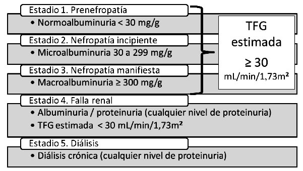 Recientemente, el Joint Committee on Diabetic Nephropathy sugirió una nueva clasificación específica para la ND, especificando que no necesariamente se da una progresión secuencial, tal y como lo sugiere el Cuadro 1; dicha clasificación simplifica la anterior como se señala en la Figura 2.(21)