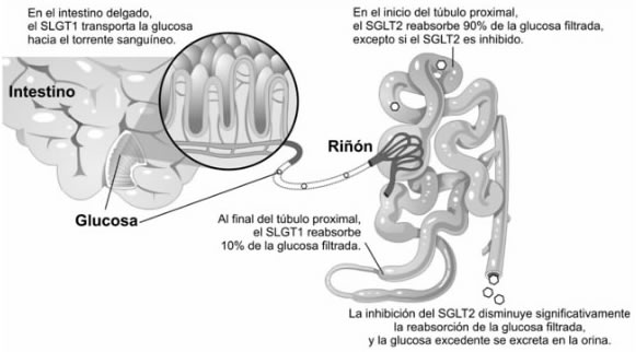 En circunstancias normales, casi toda la glucosa filtrada por los glomérulos de un adulto sano se reabsorbe mediante el SGLT2 (90%) y el SGLT1 (10%), y únicamente <1% se excreta en la orina; lo anterior lleva consigo el paso a través de las células tubulares de esta glucosa reabsorbida.