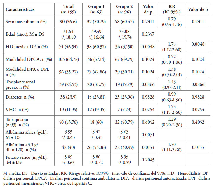 La tasa de peritonitis en nuestro centro fue de 0.37 episodios/paciente-año. El total de pacientes incluidos fueron 159, de los cuales 63 (39.62%) tuvo por lo menos un episodio de peritonitis (grupo 1= con peritonitis), y 96 (60.38%) ninguno (grupo 2= sin peritonitis).