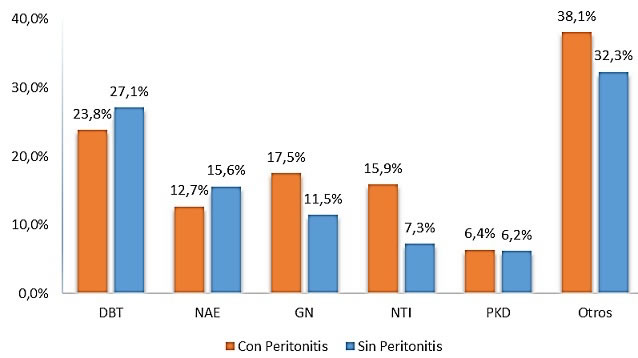 Para evaluar las causas predisponentes de peritonitis se usó como medida de asociación el Riesgo Relativo (RR), con su intervalo de confianza del 95% (IC 95%). Las variables que mostraron significación estadística se analizaron por regresión logística múltiple.