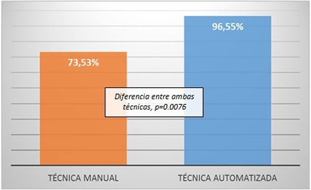 La incorporación del nuevo método de recolección de muestras del líquido peritoneal y procesamiento para cultivo por BACTEC incrementó de manera significativa el número de cultivos positivos en pacientes que cursan una peritonitis, comparado con la técnica manual (técnica manual: 73.55% de cultivos positivos vs técnica automatizada: 96.55%; p=0.0076). (Figura 2)