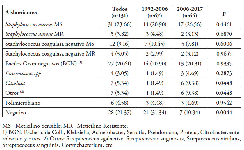Los microorganismos aislados con mayor frecuencia fueron: Staphylococcus aureus Meticilino sensible (MS) (n:31, 23.66% del total), Bacilos Gram negativos (n:27, 20,61%; Escherichia coli fue la más frecuente n:7, 5.34%), Staphylococcus coagulasa negativo MS (n:12, 9.16%), Candida (n:7, 5.34%) y otros (n:7, 5.34%). Existieron diferencias entre el periodo 1992-2006 y 2006-2017 en la prevalencia de aislamientos de Candidas (1.49% vs 9.38%, p=0.0448), en la categoría Otros (1.49% vs 9.38%, p=0.0448) y en los cultivos negativos (31.34% vs 10.94%, p=0.0044). (Tabla 2)
