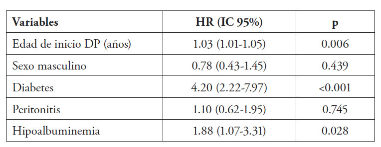 En los pacientes con peritonitis (n:63) la mortalidad fue de 55.56% (35 eventos), y el tiempo medio de sobrevida fue de 11.11 años (IC 95% 8.54-13.68). En los pacientes sin peritonitis (n:96) la mortalidad fue de 39.58% (38 eventos), y el tiempo de sobrevida fue de 12.45 años (IC 95% 10.29-14.61). Existieron diferencias significativas entre el porcentaje de mortalidad de ambos grupos (p=0.0480), pero no se encontraron diferencias en la comparación de las curvas de sobrevida (Figura 3). En el análisis multivariado la edad de inicio de DP (HR 1.03; IC95% 1.01-1.05; p=0.006), el antecedente de Diabetes (HR 4.20; IC95% 2.22-7.97; p<0.001) y la hipoalbuminemia (HR 1.88; IC95% 1.07-3.31; p=0.028), fueron factores de riesgo independientes de mortalidad, no así el sexo masculino y la peritonitis. (Tabla 3)