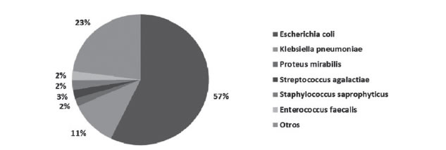 Los gérmenes encontrados en órden decreciente fueron Klebsiella pneumoniae 215 (11%), Staphylococcus saprophyticus 39 (2%), Streptococcus agalactiae 39 (2%), y Proteus mirabilis 39 (2%). En el Grafico 1 se observa el porcentaje de aislamientos de los microorganismos más frecuentes en las muestras de urocultivos examinadas.