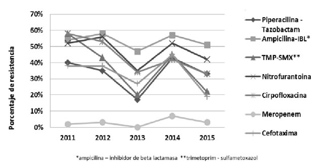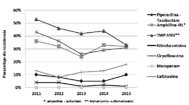 La resistencia a la ampicilina – sulbactam fue constante a lo largo de los años a excepción del año 2013 que descendió a 24 %. En cuanto al trimetoprim – sulfametoxazol (TMP-SMX), la resistencia ha ido disminuyendo paulatinamente; de 53% en el 2011 a 33% en el 2015. La nitrofurantoína presenta una resistencia media de 2 % en los años estudiados. La ciprofloxacina al igual que la ampicilina – sulbactam presentaba una disminución progresiva de la resistencia, inicialmente 43% en el 2011, llegando a 26% en el 2013 para incrementarse luego hasta el 31% en el 2015. Con relación al betalactámico cefotaxima, la resistencia se mantuvo constante del 2011 al 2014 con un leve aumento que alcanzó al 18% en 2015. Se evaluó además la resistencia a cefalosporinas de 1ra. Generación (cefalotina) que en promedio fue 24%.