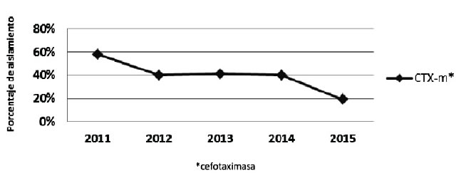 Con relación al betalactámico cefotaxima, en el Grafico 4 se observa que, la resistencia de Klebsiella pneumoniae se mantuvo constante y elevada con un promedio de 45 % entre el 2011 al 2014, y descendiendo a 19 % en el 2015; la enzima responsable identificada de dicha resistencia fue del tipo cefotaximasa (CTX-m).