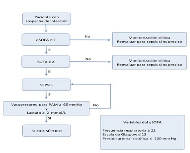 Cuando al menos 2 de los 3 criterios están presentes, este score adquiere una validez predictiva similar al SOFA (Sepsis-Related, Organ, Failure, Assessment) para la detección de aquellos pacientes con sospecha de infección y probabilidad de presentar una evolución desfavorable, por lo que resultaría útil para la identificación de pacientes que pudieran precisar de un nivel de vigilancia más estrecho y un estudio más específico en busca de la disfunción orgánica.(16) El qSOFA es un score ideal para ser aplicado en el medio extra-hospitalario, sala de urgencias o en las salas generales a nivel hospitalario.