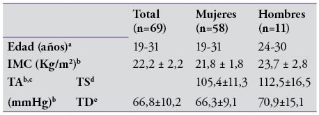 Se estudiaron 100 alumnos de ambos sexos, de raza blanca. Luego de aplicar los criterios de exclusión, la muestra de referencia fue de 69 alumnos cuya edad, IMC y TA se describen en la Tabla 1. La muestra tuvo un predominio de mujeres ya que refleja la constitución por sexo de la población estudiantil de la Carrera de Bioquímica de la UNL.