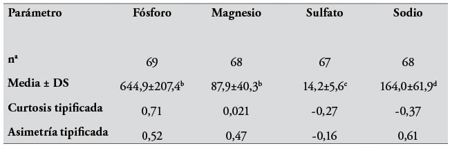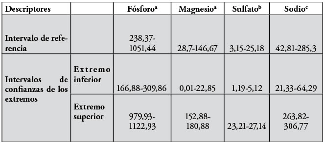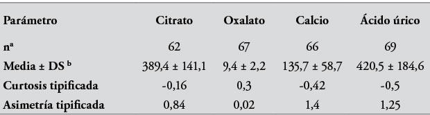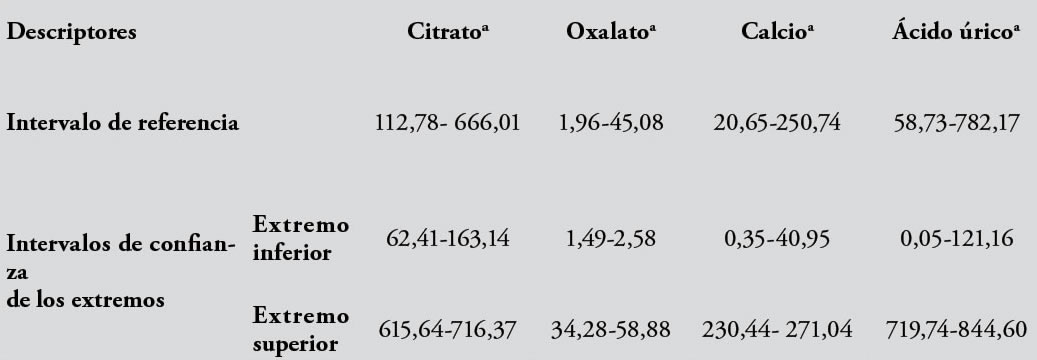 Elaboración a partir de resultados propios del proyectoSe estudiaron estadísticamente las distribuciones de los grupos de datos, los resultados son presentados en las Tablas 3.a y 3.b. Los resultados obtenidos para citrato, ácido úrico, calcio, fósforo, magnesio, sodio y sulfato tuvieron una distribución normal (p>0,05). El oxalato alcanzó esta condición luego de realizar una transformación logarítmica. Por lo tanto, el cálculo de todos los intervalos de referencia se realizó utilizando el método paramétrico.