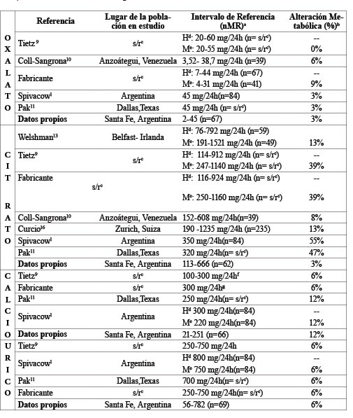 Para el citrato el límite de interés clínico es el inferior. Se presentan ocho valores de corte incluyendo el hallado. En este caso los valores comparados muestran grandes diferencias entre sí (desde 76 a 350 mg/24h) y con el valor hallado (113 mg/24h). Esto lleva a que el diagnóstico de hipocitraturia de la muestra estudiada varíe entre el 3 y el 55% según el VR utilizado.