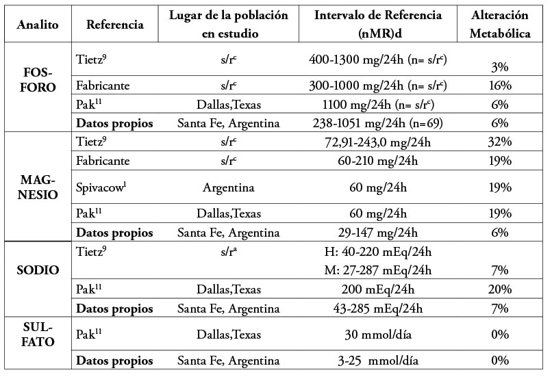 Se establecieron valores de referencia para citrato, oxalato, calcio, ácido úrico, fósforo, sulfato, magnesio y sodio en orina de 24 horas en una muestra de referencia de estudiantes de Santa Fe, Argentina. Se determinaron las alteraciones metabólicas según los VR hallados.