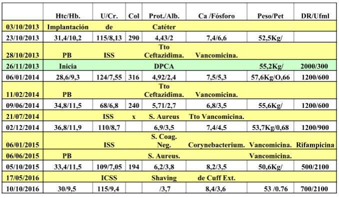 Referencias: Htc: Hematocrito (%). Hb: Hemoglobina (g/dl). U: urea (mg/dl). Cr: Creatinina (mg/dl). Col: Colesterol (mg/dl). Prot: Proteínas (g/dl). Alb: Albúmina (g/dl). Ca: Calcio (mg/dl). Pet: Test de Equilibrio Peritoneal. DR: Diuresis Residual (ml/24hs). Uf: Ultrafiltración (mg/24hs). PB: Peritonitis Bacteriana. ISS: Infección del Sitio de Salida. ICSS: Infección Crónica del Sitio de Salida.