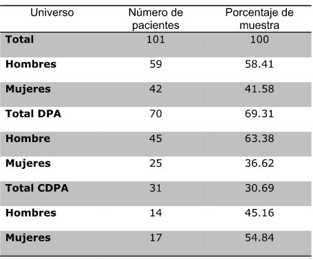 La población total intervenida en este hospital mediante la diálisis peritoneal crónica es de 101 pacientes, de los cuales el 30.69% son de diálisis peritoneal con CAPD con una cantidad de 31 pacientes de los cuales el 45.16% son hombres (14 personas) y el 54.84% son mujeres (17 personas). El 69.31% restante es manejada mediante la estrategia de intervención APD, donde el 64.28% son hombres (45 personas) y el 35.71% son mujeres (25 personas). (Tabla 1)