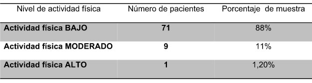 Los datos recolectados en la población consultante del Hospital Militar Central bajo la intervención de diálisis peritoneal arrojó que del 100% de la muestra recogida correspondiente a 81 pacientes (Tabla 2), estableció que en el 71% de la población o muestra presentaron un nivel de actividad física bajo entendiendo esta como la realización de menos de 600 mets/min/sem o de 3 días de actividad física mayor o igual a 20 minutos, el 11.1% presenta un nivel de actividad física moderada cumpliendo mas de 600 mets/min/sem o 3 días de actividad física moderada por mas de 20 min y solo el 1,2% de la población presenta un nivel de actividad física alta logrando más de 1500 mets/min/sem. (Tabla 3)