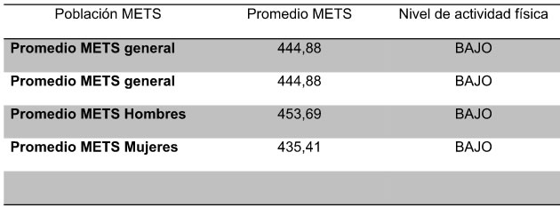 En relación al género se logró entrevistar a 42 hombres y 39 mujeres, de los cuales no se evidencia una diferencia significativa en términos de actividadfísica o ejercicio, dado que ambos géneros se encuentran en un nivel de actividad física bajo con un promedio de 453,69 y 435,41 mets/min/sem respectivamente. (Tabla 4)