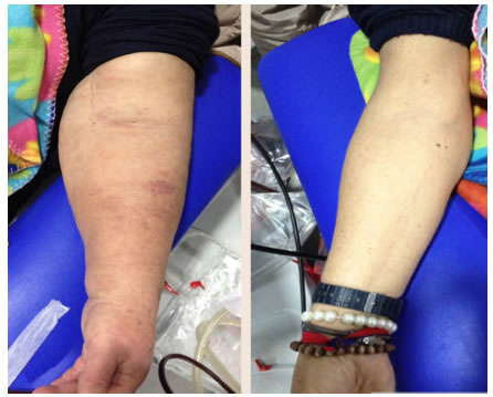 Mujer de 63 años con enfermedad renal crónica de etiología no filiada en programa de hemodiálisis desde julio de 2015. Inicia la técnica a través de catéter permanente yugular derecho, colocado ese mismo mes. Se realiza FAV humerocefálica izquierda en septiembre de 2015, con importante edematización de brazo en el postoperatorio inmediato, además, a las pocas semanas presenta clínica de robo en la mano de la FAV (Imagen 1a y 1b). Tras un mes de maduración, se constata FAV funcionante y desarrollada por lo que se inicia punción con una aguja, pero a las pocas sesiones se decide la interrupción de las punciones debido a tiempos de hemostasia prolongados sin mejoría del edema.