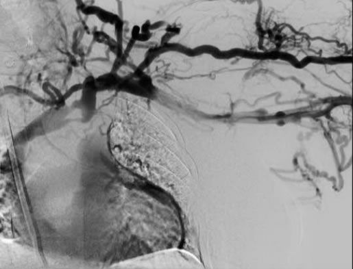 Presentamos este caso para destacar la importancia de seguir una estrategia terapeútica secuencial, combinando los métodos endovasculares y quirúrgicos necesarios para solucionar el cuadro acompañante a esta insólita lesión, que con pruebas de imagen más sensibles se podría haber evitado, pero al no estar protocolizadas, sólo se realizan en casos con sospecha de estenosis central, por lo que prevenir este tipo de complicaciones es dificultoso.(6)