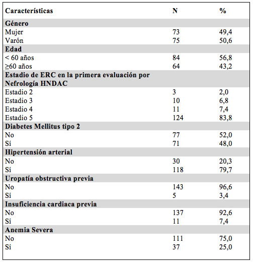Se evaluó 148 pacientes, el promedio de edad fue 55,4 años ± 13,4, 50,6% fueron varones. 83.8% tuvo ERC5 al momento de la referencia al nefrólogo, 48% tenía antecedente de diabetes mellitus (DM) y 79.7% de hipertensión arterial (HTA). Además, 25% de pacientes tuvo anemia severa. Las características generales de la población de estudio se resumen en laTabla 1.