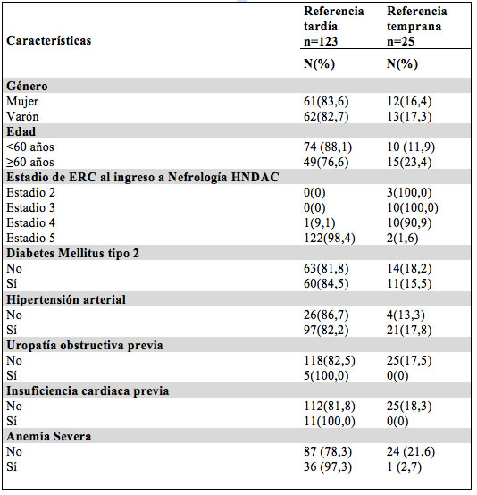 La frecuencia de referencia temprana fue de 17% (n=25). El porcentaje de mujeres y varones con referencia temprana fue similar. Los > 60 años tuvieron mayor porcentaje de referencia temprana (23%) comparado con los < 60 años (12%). La mayoría de los pacientes con ERC5 fueron referidos de manera tardía (98%). La referencia temprana fue similar en pacientes con DM vs sin DM (15% versus 18%) y con HTA vs sin HTA (17% versus 13%). Ningún participante con uropatía obstructiva o insuficiencia cardiaca fue referido tempranamente al nefrólogo. Los participantes con anemia severa tuvieron menor porcentaje de referencia temprana (2,7% versus 21,6%). Las características de la población de estudio según el tipo de referencia al nefrólogo se muestran en la Tabla 2.