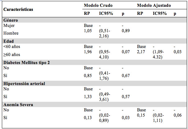 En el modelo crudo, se evidencia asociación marginal entre la edad y referencia temprana; los pacientes >60 años tienen mayor frecuencia de referencia temprana al nefrólogo PR=1,96; IC 95% (0,95-4,10); p=0,07. Se evidencia asociación estadística entre anemia severa y menor frecuencia de referencia temprana al nefrólogo PR=0,13; IC 95% (0,02-0,89); p=0,03. El resto de variables analizadas no tuvieron significancia estadística. En el modelo ajustado la edad se asoció con mayor frecuencia de referencia temprana; los mayores de 60 años tuvieron más del doble de frecuencia de tener referencia temprana al nefrólogo PR= 2,17; IC 95% (1,09-4.32); p=0,03. La anemia severa solo tuvo significancia marginal con menor frecuencia de referencia temprana al nefrólogo PR=0,15; IC 95% (0,02-1,11); p=0,06. El modelo lineal generalizado de la familia Poisson crudo y ajustado se muestra en la Tabla 3.