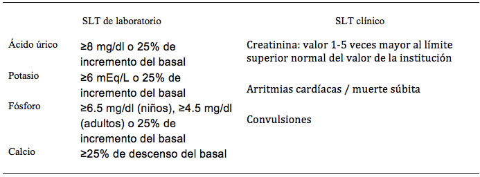En el año 2004 Cairo y Bishop publicaron un nuevo sistema de clasificación, que es el más utilizado actualmente, modificando el previamente existente con el objetivo de que fuera práctico, fácilmente reproducible y clínicamente relevante (Tabla 1).(7) El SLT de laboratorio (SLTL) se define como la presencia de dos más de las alteraciones desde los 3 días previos hasta los 7 días posteriores al inicio de la quimioterapia. Se asume que el paciente recibirá hidratación adecuada y fármacos hipouricemiantes. El diagnóstico de SLT clínico (SLTC) requiere la presencia de SLTL y una o más de las alteraciones clínicas descritas asociadas con SLT: insuficiencia renal, arritmias cardíacas/muerte súbita y convulsiones. Además propusieron un sistema de graduación para determinar la gravedad del cuadro teniendo en cuenta la presencia o no de dichas manifestaciones clínicas.
