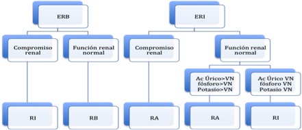 El tercer paso consiste en realizar un ajuste a la estimación de riesgo según la presencia o no de compromiso renal que incluye: enfermedad renal crónica, hiperuricemia preexistente, orina ácida, flujo urinario disminuido, deshidratación, oliguria, anuria e injuria renal. Estas alteraciones pueden predisponer al SLT por lo que deben ser tomadas en cuenta en la estratificación de riesgo y los pacientes que presenten alguna de ellas serán clasificados como con compromiso renal lo que determina un incremento en el riesgo de lisis tumoral, por lo tanto, los pacientes que tenían ERB, al presentar dicho compromiso, se recatalogarán como pacientes con riesgo intermedio (RI) y los que inicialmente tenían ERI, tendrán riesgo alto (RA) de lisis tumoral. (Figura 2)