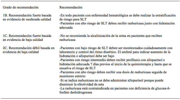 La rasburicasa es una urato oxidasa recombinante derivada del Aspergillus aprobada por la US Food and Drug Administration (FDA) en el año 2002 para el manejo inicial de la hiperuricemia en pacientes pediátricos con leucemia, linfoma y tumores sólidos que reciben tratamiento antineoplásico. En el año 2009 se aprobó para pacientes adultos. La rasburicasa cataliza la conversión de ácido úrico en alantoina que es 5 a 10 veces más soluble que el ácido úrico y se excreta a nivel renal. La dosis recomendada es de 0,2 mg/kg/día por 5 días en infusión endovenosa. No se requiere ajuste según el filtrado glomerular. Está contraindicada en pacientes con deficiencia de glucosa-6-fosfato deshidrogenasa por el riesgo de metahemoglobinemia y hemólisis y puede desencadenar la formación de anticuerpos en el 10% de los pacientes.(4) Se recomienda su utilización profiláctica en pacientes con riesgo alto de lisis tumoral y como tratamiento en pacientes con SLT e hiperuricemia.(6) La principal limitación a su uso es su elevado costo por lo que actualmente se recomienda el uso de dosis única al inicio del tratamiento sustentado en el resultado de estudios de cohorte que demostraron persistencia del efecto. Las recomendaciones de uso de este fármaco se basan en unos pocos ensayos que mostraron una disminución significativa de los niveles de ácido úrico luego de su administración, algunos en comparación con el uso de allopurinol. El ensayo de Cortes y colaboradores dividió a los pacientes en tres grupos de tratamiento: un grupo recibió rasburicasa, otro recibió rasburicasa seguida de allopurinol y el tercer grupo fue tratado con allopurinol. Se reportó un 87% de descenso de los niveles de ácido úrico en el primer grupo, 78% en el segundo y 66% en el grupo que sólo recibió allopurinol. El grupo que recibió sólo rasburicasa tuvo una respuesta (descenso de los niveles de ácido úrico) significativamente mayor a las de otros grupos inclusive en pacientes con alto riesgo de padecer SLT y en aquellos con hiperuricemia preexistente.(22)