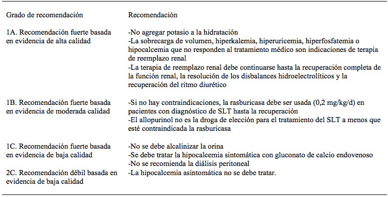Se revisaron las opciones terapéuticas propuestas actualmente en la literatura haciendo especial hincapié en que la recomendación de usar rasburicasa no se basa en evidencia científica de alta calidad por lo que el médico tratante debe ser juicioso a la hora de utilizarla conociendo los riesgos y beneficios de su uso. Se requieren trabajos randomizados y controlados que comparen las opciones terapéuticas actuales en cuanto a la evolución clínica de los pacientes sometidos a ellas..