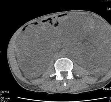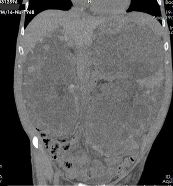 Upper and lower abdominal midline incision was performed for surgical exposure and the procedure lasted in 150 minutes. The surgical specimen weighed nearly 4500 gr and the maximum diameter was 43 cm (Figure 1d). There were no intraoperative or postoperative complications and the patient was discharged on postoperative 7th day. The patient's nutritional problems and abdominal pain improved after nephrectomy. Histopathological analysis revealed a multicystic kidney compatible with renal cystic disease. The patient is still waiting for kidney transplantation from cadaver-donor. 3rd month follow-up was uneventful and in the last three months period he gained 4 kg and BMI was increased to 20.3.
