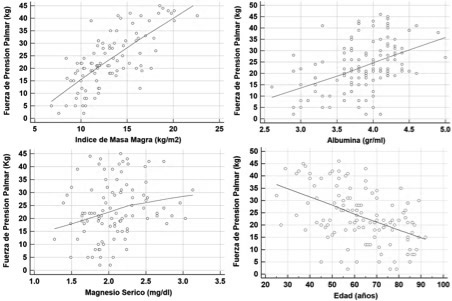 Podemos concluir que los factores asociados a la fuerza de prensión palmar en nuestra población son similares a los reportados previamente en otros estudios; y que el magnesio sérico podría ser potencialmente un factor influyente y fácilmente modificable de la fuerza muscular de los pacientes en terapia sustitutiva renal, pero se requieren estudios con mayor cantidad de pacientes y diseño específico para confirmar dicho hallazgo.