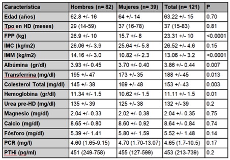 Realizamos un trabajo de tipo observacional de corte transversal prospectivo. Analizamos un total de 139 pacientes (hombres: mujeres = 88:51, edad 60.7 +/- 16), 18 fueron excluidos por falta de datos (8 se rehusaron a realizar la prueba de FPP, 10 no tenían albumina sérica dentro del periodo de la realización de las mediciones). El porcentaje de comorbilidades fue el siguiente: Diabetes 21.4% (n= 26), hipertensión actual o histórica 73.1% (n= 71), enfermedad vascular (incluye cardiovascular, cerebrovascular y vascular periférica) 44.3% (n= 43), tabaquistas o ex-tabaquistas 51,2% (n= 62). En la Tabla 1se resume el resto de las características clínicas y nutricionales relevantes de los pacientes.