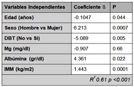 Para el análisis multivariado pudieron incluirse 97 pacientes ya no se pudo realizar la bioimpedanciometría en 24 individuos. Con las variables que resultaron correlativas en el univariado se realizó un análisis multivariado y se obtuvieron los siguientes resultados (R2 0.61 p <0.001): albúmina (ß: 4.36 p 0.02), IMM (ß: 1.44 p <0.001), edad (ß -0.10 p 0.04), sexo (ß 6.21 p 0.007), diabetes (ß -5,08 p 0.005). Es de destacar que de los parámetros que fueron correlativos en el univariado el único que no pudo ser sostenido en el multivariado fue el magnesio en suero. (Tabla 2)