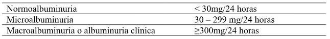 Se definió como nefropatía diabética a todo paciente con albuminuria de 24 hs mayor o igual a 30mg con o sin elevación de la creatinina sérica, hallazgo confirmado en consultas subsecuentes en todos los pacientes incluidos. Aunque podría haberse realizado una tasa de albúmina/creatinina (ACR), se utilizó la prueba patrón oro o “gold standard” (albuminuria de 24 hs), considerando la variabilidad y errores de interpretación en las tasas de excreción de albúmina urinaria, descartando así, los falsos positivos y negativos, de igual manera, se tuvo presente que los pacientes pueden mantener elevadas tasas de excreción de albuminuria sin presentar hiperazoemia.(8) De esta forma, los resultados fueron clasificados en 3 categorías tradicionalmente usadas para evaluación y estadificación de los pacientes con albuminuria de 24 hs en ND en la práctica clínica. (Tabla 1)
