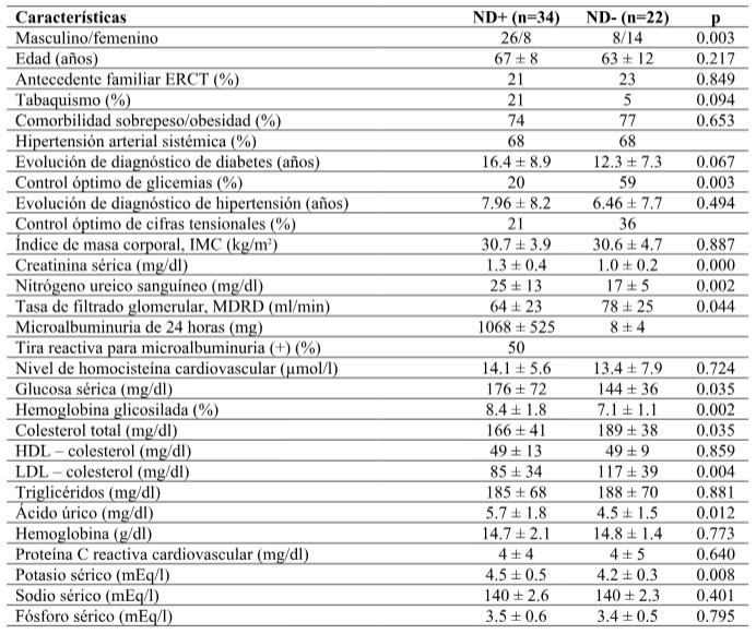 Es oportuno mencionar, que el nivel de creatinina no suele ser un parámetro independiente completamente fiable para su tamizaje ya que muchos pacientes con ND mantienen niveles relativamente normales, algo que fue evidente en nuestro trabajo (1.3 ± 0.4 mg/dl) en comparación a los pacientes sin ND (1.0 ± 0.2 mg/dl).