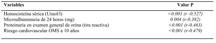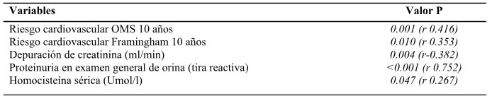 Al establecer una correlación de variables, se encontró asociación negativa significativa entre la depuración de creatinina y niveles de microalbuminuria (p 0.004, r-0.382), homocisteína sérica (p <0.001, r -0.527) y el riesgo cardiovascular según OMS a 10 años (p <0.001, r-0.479). (Tabla 3)