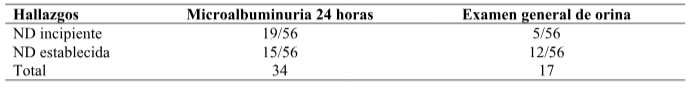 La pequeña cantidad de pacientes enrolados en nuestro estudio constituye nuestra mayor limitante, sin embargo, se pudo demostrar que con una búsqueda intencionada de alteraciones urinarias mediante un cribado, empleando pruebas sencillas disponibles, es posible la detección temprana de ND.