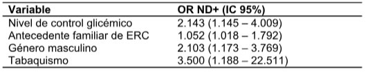 Considerando la información obtenida se estimó el riesgo relativo para padecer nefropatía diabética (Tabla 6), encontrando como factores asociados al nivel de control glicémico, tabaquismo, género masculino y antecedente familiar de nefropatía crónica.