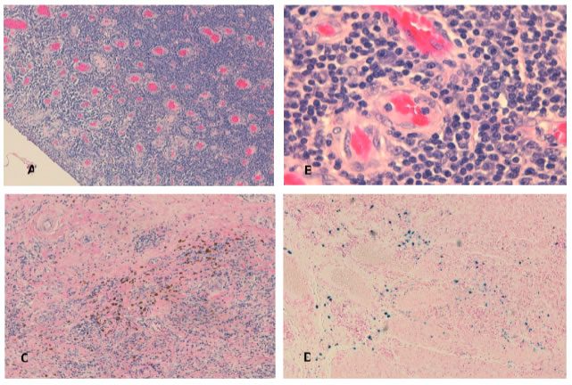 Durante la colonoscopia el paciente sufre una perforación de sigma que requiere cirugía urgente. En la intervención llama la atención la existencia de dos lesiones (de 3,2 y 1,5 cm) a nivel de yeyuno que se extirpan. El estudio anatomopatológico pone de manifiesto un sarcoma de Kaposi intestinal. (Figura 1 y 2)