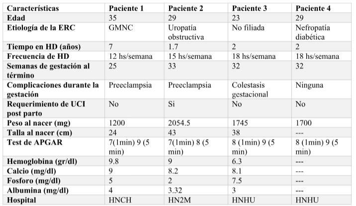 Paciente de 35 años con diagnóstico de ERCHD desde hace 7 años, siendo una Glomerulonefritis crónica la etiología de la misma. Desde el diagnóstico de embarazo, fue considerada como embarazo de alto riesgo (ARO) y se prescribió una dosis de diálisis de 12 hs. por semana en el HNCH. No se tiene registro de la dosis de heparina por sesión de diálisis. El parto fue por cesárea y ocurrió a las 25 semanas de gestación. La única complicación descrita en los controles pre natales fue preeclampsia.