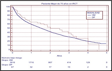 En Inglaterra se comparó la evolución de pacientes de 70 años o más en HD y DP, no encontrándose diferencias en la mortalidad, número de internaciones y calidad de vida.(18) Parecería además, que existe una pequeña ventaja para la DP automatizada versus la manual.(19)