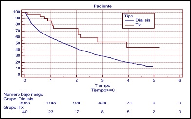 La mediana de sobrevida fue de 3.9 años (IC 95% 1.5 a 3.93) para los pacientes trasplantados, al momento del fallecimiento el 66% tenían injerto funcionante. La mediana de sobrevida en pacientes en HD fue 1.53 años (IC 95% 1.43 a 1.63), y en los de DP: 2.02 (IC 95% 1.5 a 3.2).