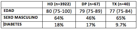 Otra de las opciones es la DP, en nuestra población en estudio encontramos que sólo un 1.7% de ellos ingresaban a esta modalidad. Existen diferencias entre distintos países en la proporción de pacientes mayores que realizan TSR con DP, aunque todos superan nuestra cifra: en el Reino Unido el 11.3% de pacientes mayores de 75 años prevalentes en diálisis se encuentran en DP, cifra similar en el resto de Europa, un 12% en Canadá y sólo un 5.5% en Estados Unidos.(11)