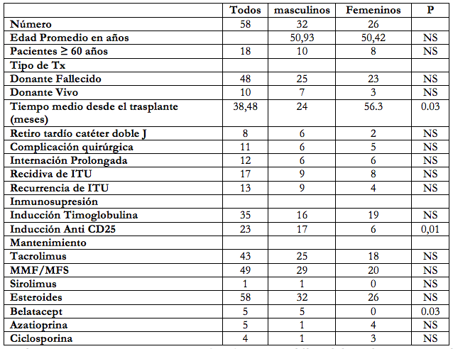 La inmunosupresión de mantenimiento fue con esteroides en los 58 (100%) pacientes, tacrolimus en 43 (74%) y micofenolato en 49 (84%). Solo 1 (1,7%) paciente recibió sirolimus y 5 (8,6%) fueron tratados con belatacept.
