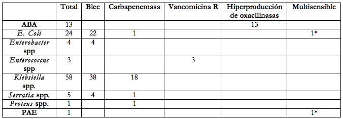 Los gérmenes rescatados fueron 13 A. baumanii cpx. (ABA) (11,92%), E. Coli (ECO) 25 (22,01%), Enterobacter spp. 4 (3,66%), Enterococcus spp. 3 (2,75%), Klebsiella spp. 58 (53,21%), Serratia spp. 5 (4,58%), Proteus spp. 1 (0,91%) y Pseudomonas aeruginosa (PAE)1 (0,91%), en la Tabla 2 se pueden ver los gérmenes y sus mecanismos de resistencia.