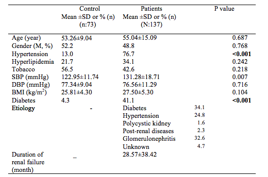 Inclusion and exclusion criteria Thirty-two chronic hemodialysis and 105 predialysis patients as well as 73 healthy controls were enrolled in the study. Hemodialysis patients were undergoing 3 sessions per weekly. Each session lasted 4 hours and enoxiparin sodium 40 mg/session was used for each patient. Control group consist of individuals who have no history of cardiac disease and kidney failure as well as matched individuals in terms of age, gender.