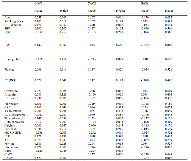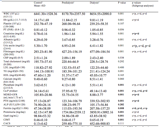 (WBC: White blood count, Hb:hemoglobin, PT: Protrombin time, CRP:C-reactive protein, LDL: Low density lipoprotein, TG: Triglycerides, HDL: High density Lipoprotein, MDRD-GFR: Modification of diet in renal Deseases Glomeruler filtration rate, PTH: parathormone, ALP: Alkaline phosphatase, Gas6: Growth arrest specific protein 6, CIMT: carotid intima media thickness, CACS: coronary artery calcification score)