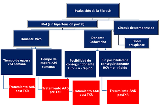 Los potenciales donantes vivos con HCV positivo deben ser tratados como la población general. Primero, debe evaluarse presencia de fibrosis del hígado y después, si no tiene cirrosis, puede recibir AAD basado en el genotipo. Aunque la RVS puede ser confirmada a las 12 semanas, parece razonable esperar a las 24 semanas para reconfirmar la RVS y reevaluar la extensión de la fibrosis. En la ausencia de fibrosis hepática una vez que la RVS se ha completado, la donación con donante vivo puede ser factible.