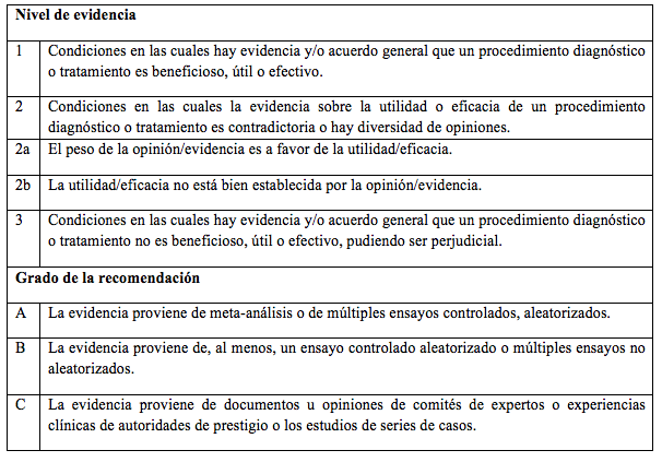 Estas recomendaciones están basadas en el análisis sistemático de la información relevante recientemente publicada. Las referencias se obtuvieron a través de una búsqueda informática en MEDLINE hasta agosto de 2018, de la revisión de las guías de práctica clínica de la AASLD, la EASL, la ALEH, la APASL y la OMS,(3-7) de la revisión de las presentaciones en congresos internacionales, y de la experiencia publicada de líderes de opinión y expertos en el tratamiento de la hepatitis C. Para caracterizar la evidencia que sustenta cada afirmación, se le asignó a cada recomendación la Clase (reflejando beneficio versus riesgo) y el Nivel de Evidencia (evaluando potencia o certeza), según ha sido recomendado (Tabla 1).(9-10) Se recomendarán los esquemas de tratamiento que se apliquen a la mayoría de los pacientes.