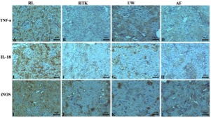 In addition to histopathology analyses, TNF-alpha, IL-18, and iNOS immune markers were used to investigate the ischemic damage in renal tissues. Sections with 4 µm width were collected on poly-L-lysin-covered slides. Primary antibodies of TNF-alpha (EMD Millipore Corporation, clone 13F9.1, Lot #Q2573230), IL-18 (Biorbyt Ltd. Cat No: orb107403) and iNOS (Cell Signaling Technology, Lot#12242) were used. Then, secondary antibody (20 min at room temperature), Streptavidin-HRP (20 min at room temperature), and DAB (3,3-diaminobenzidine tetrahydrochloride) solutions (5 min) were used in the given order. Finally, the slides were stained with hematoxylin for 10 min, and evaluation was carried out with light microscopy.