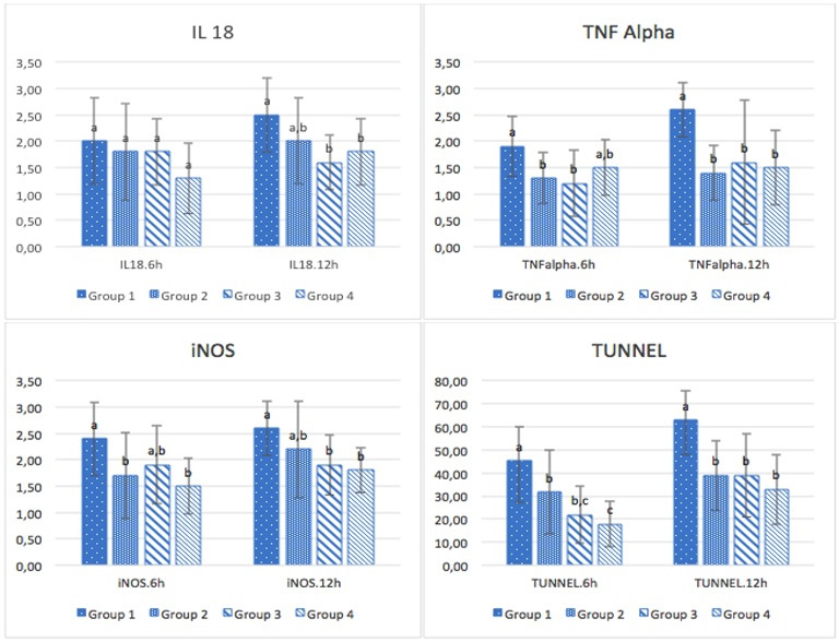 When the immunohistochemical results for the 6th hour for TNF-α are evaluated, there was a significant increase between Control Group (RL) compared to UW and HTK groups (p values are 0.024, and 0.021, respectively). When the immunohistochemical results from the 12th hour for TNF-α are evaluated, there was a significant increase in the Control group (RL) compared to HTK, UW, and AF groups (p values are 0.001, 0.044, and 0.003, respectively). There was no significant difference between the other groups.